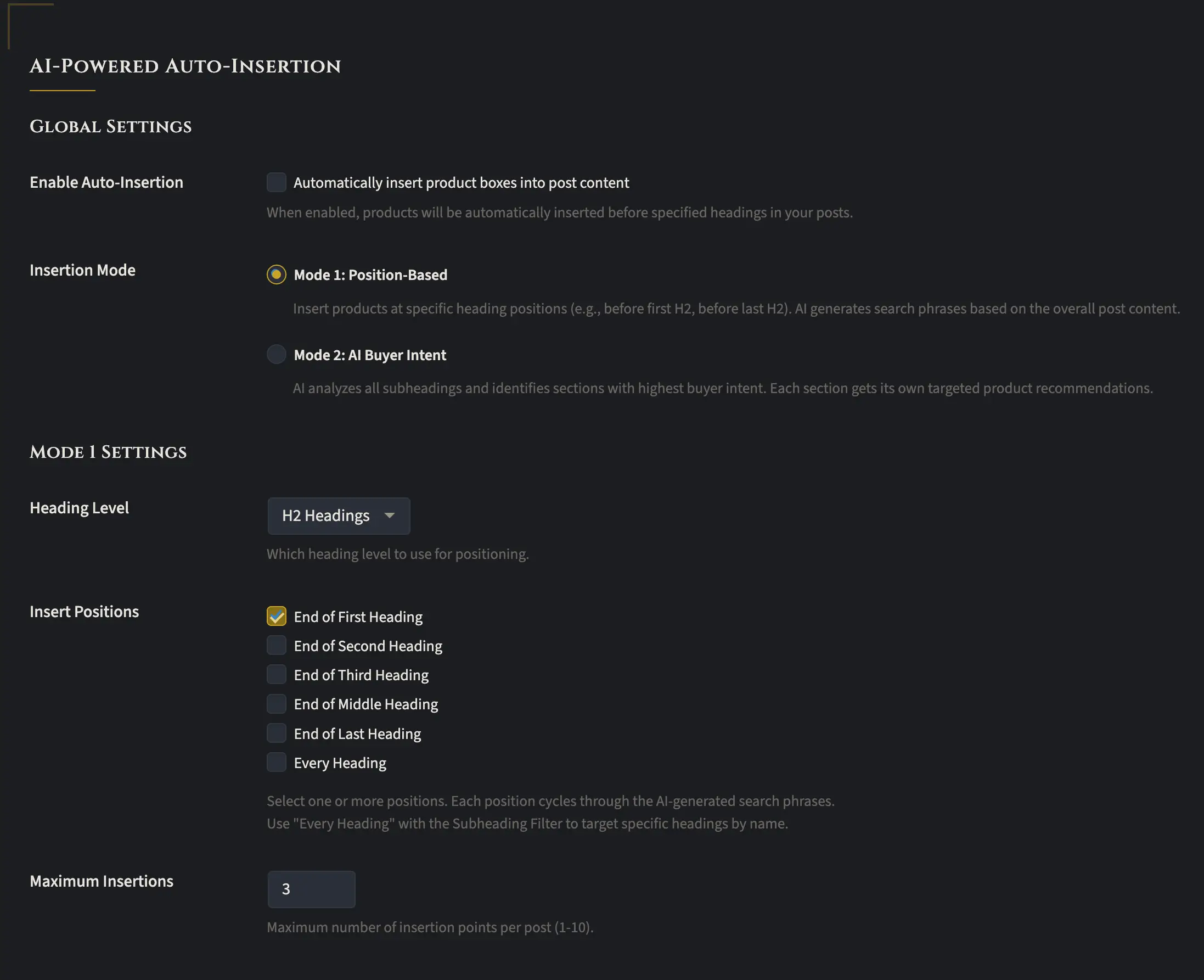 Beyond that, you can control exactly where product insertions appear. You pick a heading level (H2 or H3), and then choose the placement: after the first heading, the second, the third, or right in the middle. So if you’ve got ten H2s, the middle option might place an insertion after number four and again at the last subheading.