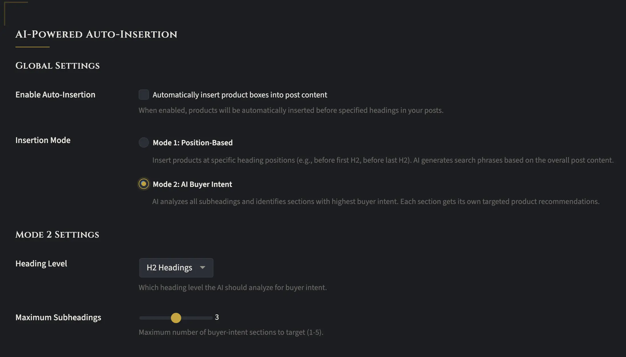 Mode two is more granular. Instead of looking at the post as a whole, it goes through every H2 or H3 subheading individually and finds products that are specifically relevant to each section. So you end up getting hyper-relevant products to the section the buyer would be reading.
