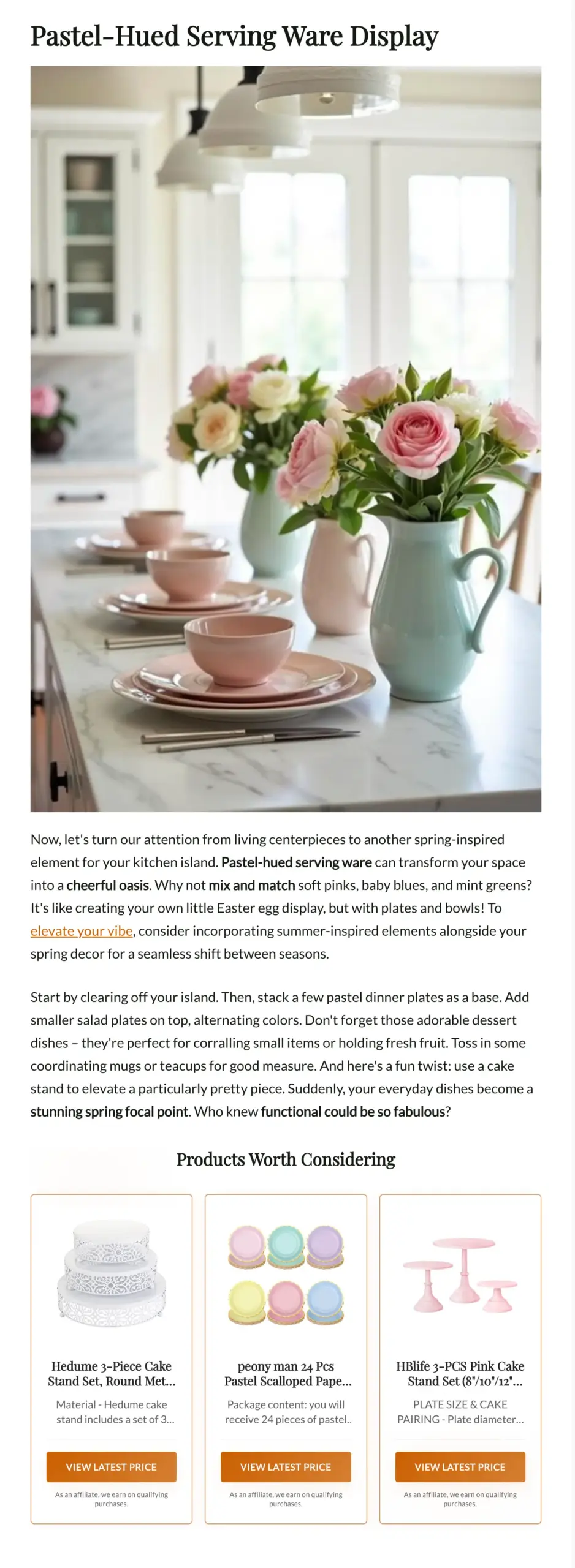 What makes mode two analysis so useful is that it focuses only on the actual content of a section. In the image above, the section is “Pastel-Hued Servingware Display,” and it’s all about how pastel servingware can transform a space into a cheerful oasis. Using mode 2 analysis, the AI finds items that are directly relevant to the content. It’s not pulling from some broader context or guessing at what might fit. It’s working with what’s actually there!