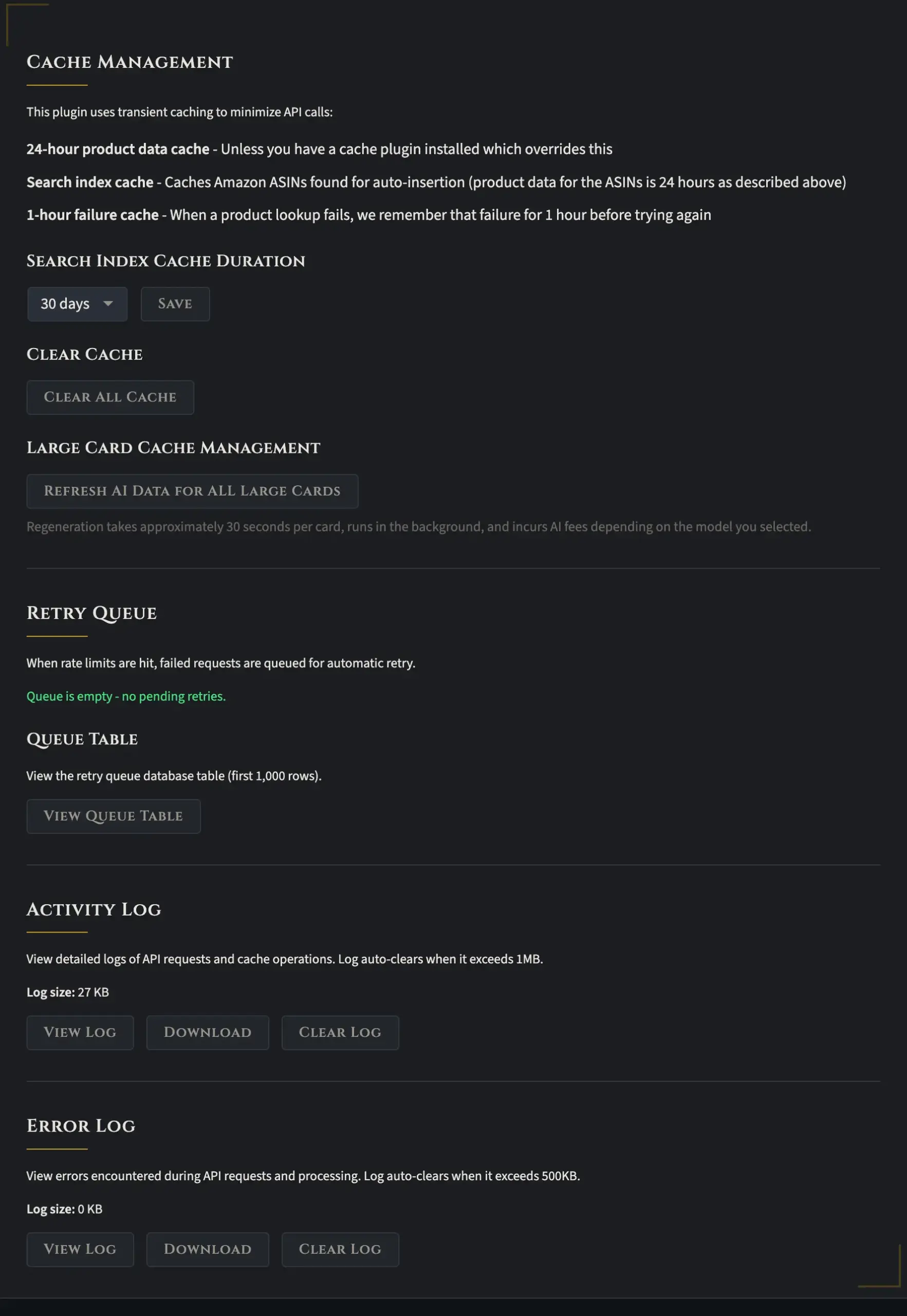The first part covers cache management and explains how caching works to keep you as compliant with Amazon’s Terms of Service as possible. Amazon requires you to refresh all cached data every 24 hours, and that’s exactly what this plugin does.